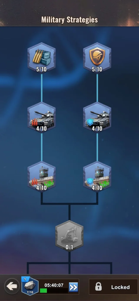 Unlocks after completing 25% of “Military Strategy.” It gives your troops an additional power boost. - Peace Shield